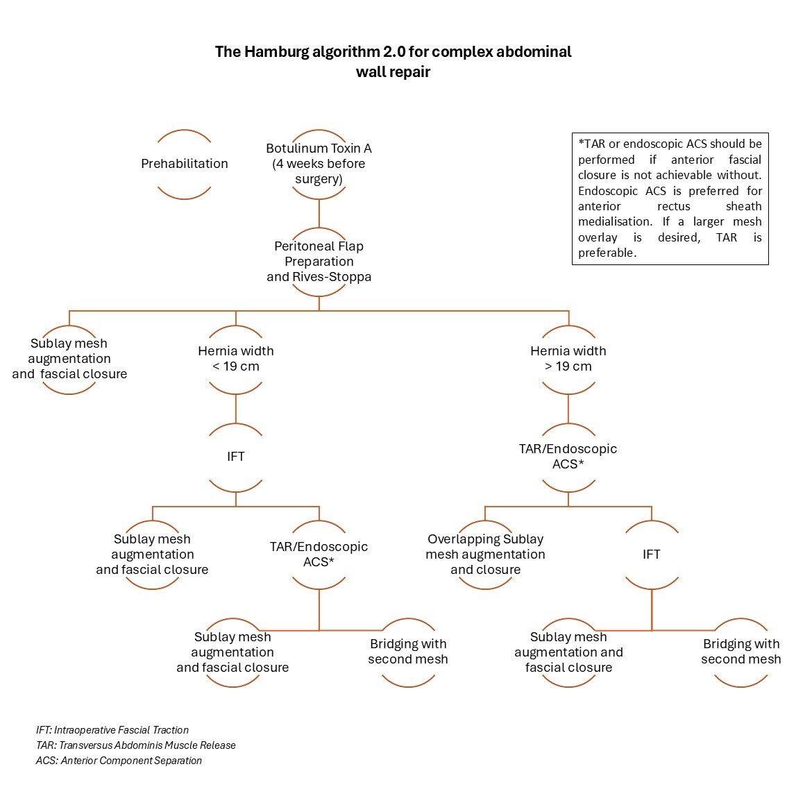 The study provides an overview of using IFT and BTA in complex hernia surgery and assesses short-term outcomes (after 30 days). Cases were included if BTA and Rives-Stoppa alone didn't lead to a reconstruction of the abdominal wall. Intraoperative reduction of transverse hernia diameter of 9.81 cm (mean) is in line with findings from previous studies. The Hamburg algorithm was developed based on the results.